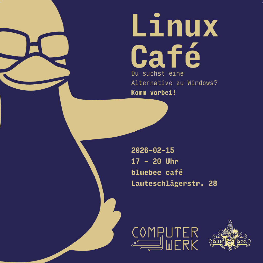 Am 15. Februar 2026 findet von 17:00 bis 20:00 Uhr das Linux Café im bluebee in der Lauteschlägerstr. 28 statt. Hier kannst du dir in gemütlicher Athmosphäre bei Kaffee und Snacks verschiedene Linux-Distributionen ansehen, Fragen stellen, über Freie Software diskutieren oder mit fachlicher Unterstützung selbst die Installation auf deinem eigenen Gerät vornehmen.